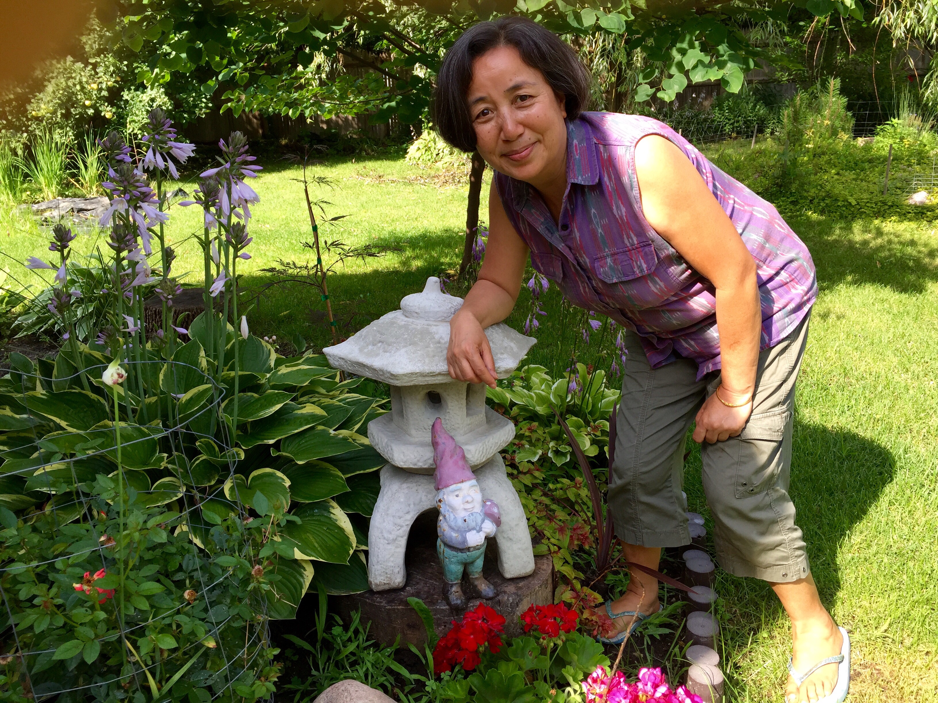 What was even more amazing, though, was her disappointment that we didn’t bring G, the traveling Blue Devil gnome. (He was taking a nap in our car and we didn’t want to disturb him when we left in another car.) Shashi’s niece joined in scolding us with a smile, saying she’s been following G’s adventures (instagram.com/davidjarmul) and wanted to see what he looks like in person. Shashi also hoped to introduce him to her own garden gnome, who you can see in the photo under her right hand.