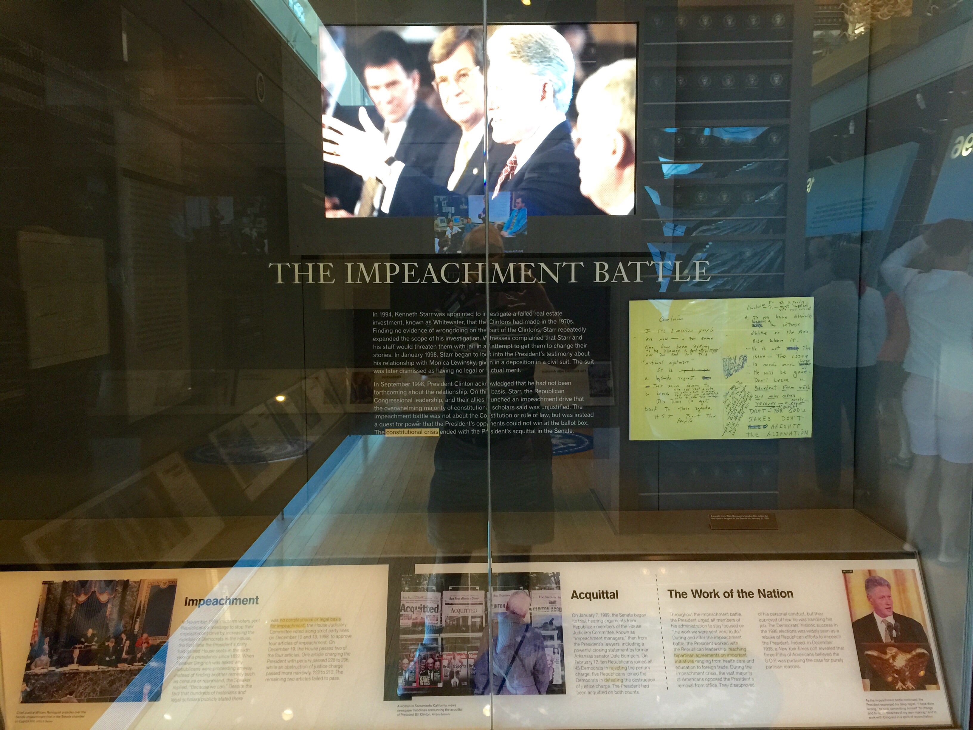 I voted for Bill Clinton twice and admire most aspects of his presidency and subsequent career. I opposed his impeachment at the time and am glad he remained in office. Nonetheless, I was disappointed by how his library dealt with the impeachment battle, presumably at his direction. It felt evasive and self-serving, at least to me.