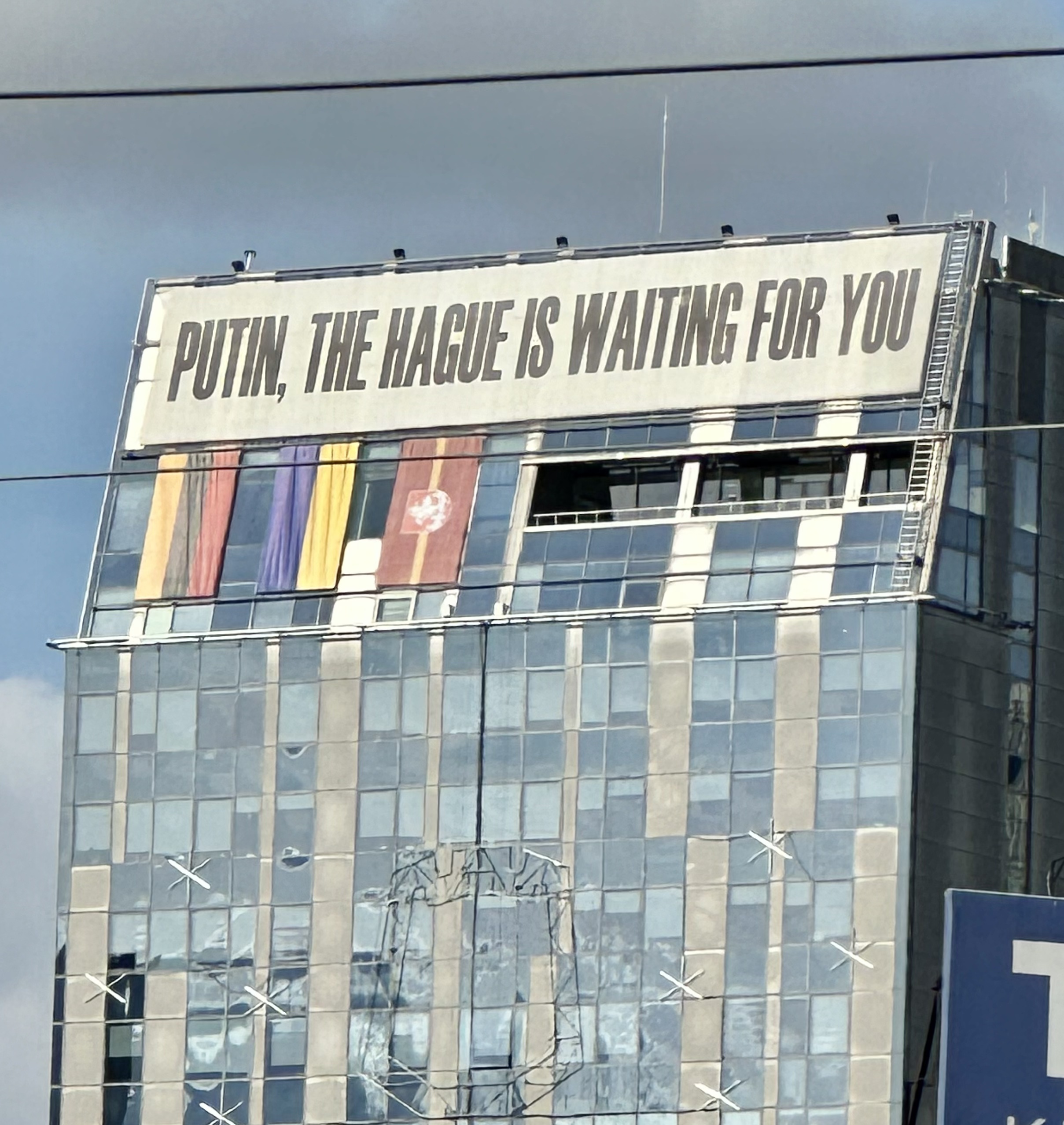 This message atop a building in Vilnius, Lithuania, reflected the popular sentiment that Russia is committing war crimes in Ukraine.