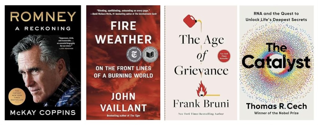 On the political front, I also enjoyed The Age of Grievance, by Frank Bruni; The Age of Revolutions by Fareed Zakaria; The Truths We Hold by Kamala Harris (remember her?) and — older but still interesting — The Paradox of Tar Heel Politics by Rob Christensen.
