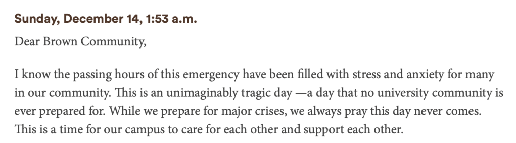 Brown made clear to panicked students, worried parents and others that “senior administrative leaders from across the University are convened in emergency command to mobilize ongoing response and support for our community.” In other words, it reassured everyone that the leadership was aware of the situation’s gravity and coordinating a response, even as police searched for the shooter and doctors treated the wounded.