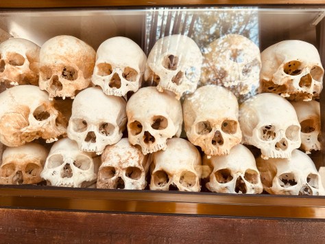 In Cambodia, the Khmer Rouge took power and unleashed a genocide following U.S. actions focused mainly on neighboring Vietnam. We visited the killing fields there, where these skulls, above, are part of a memorial. In Chile, U.S. Cold War concerns led to the overthrow of President Salvador Allende and the emergence of a brutal military dictatorship, as we saw documented at the Museo de la Memoria in Santiago, below.