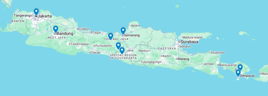 As shown on the map, we started on the western side of the island, flying from Kuala Lumpur to Jakarta. One full day was enough there to see the main sites, including a national monument where we learned a lot about Indonesia’s complicated history.