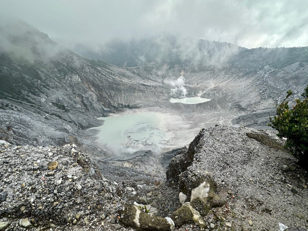 From there, we drove to Bandung, which has “only” 2.5 million people, stopping along the way to visit the Tangkuban Perahu volcano, above, with its grey craters and steaming mud pots. Our hotel in Bandung surprised me with a cake for my birthday.