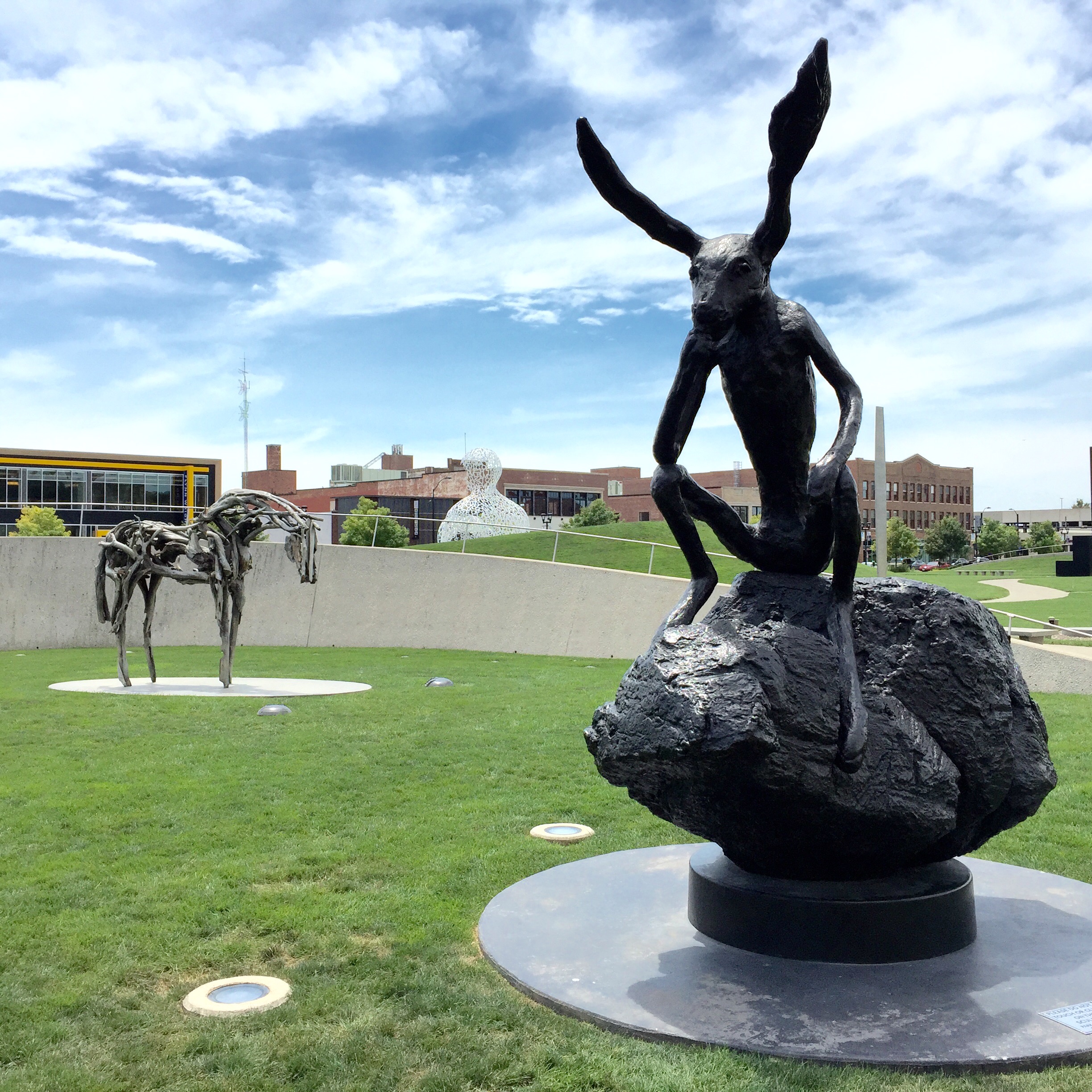 The stylized horse and rabbit are statues. We know because we saw them in a sculpture garden in downtown Des Moines.