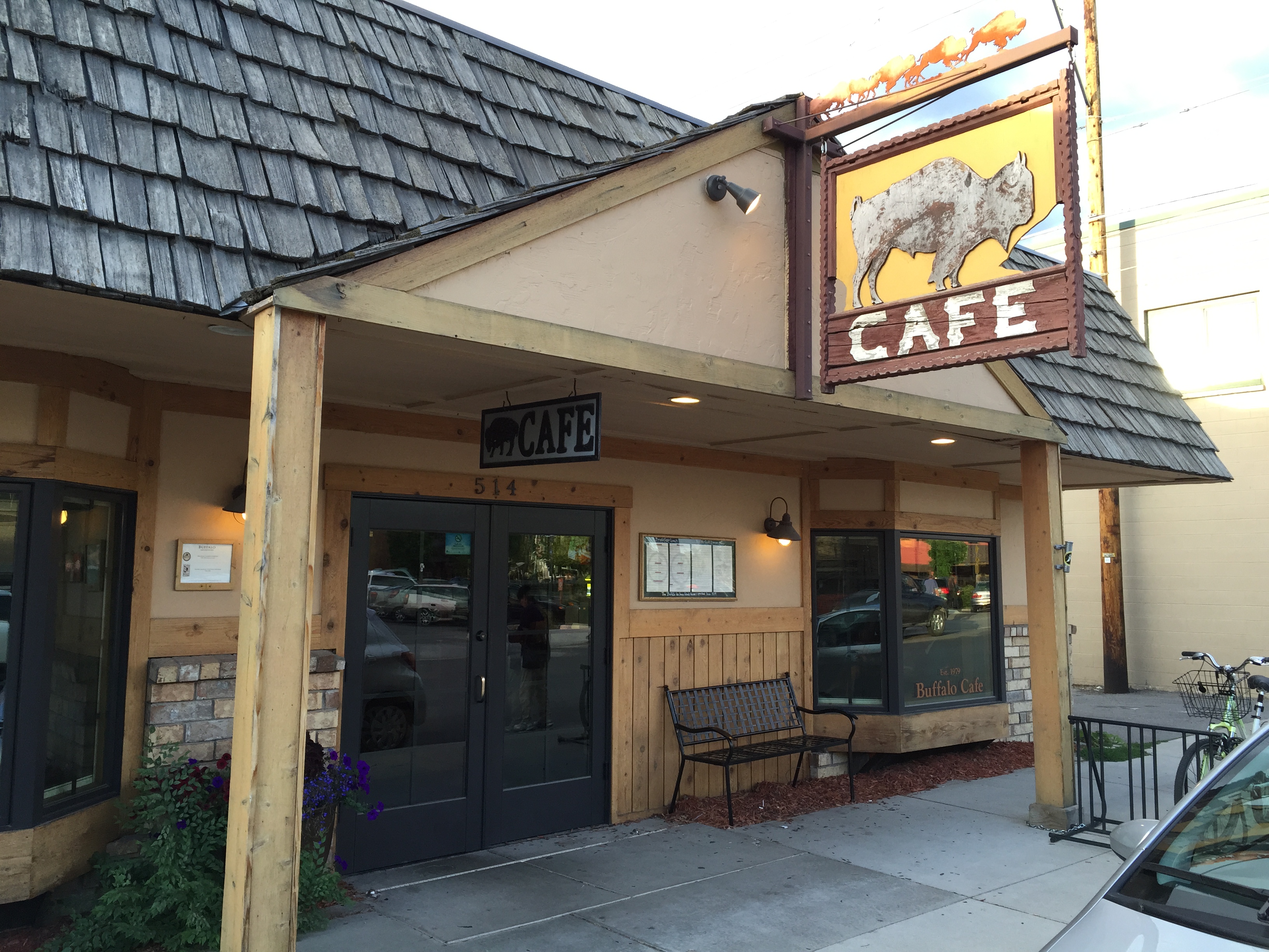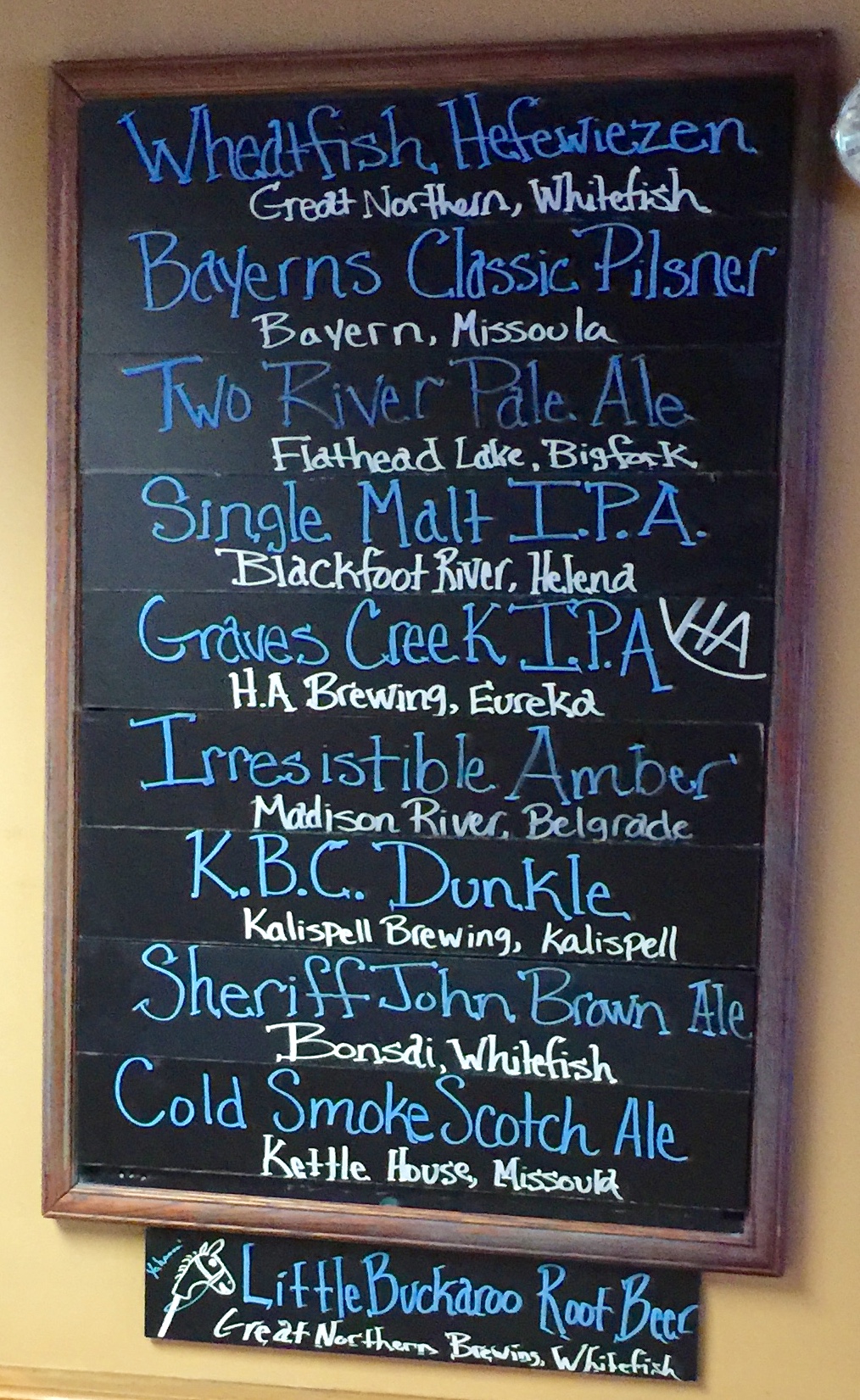 We’ve been exploring local beers throughout our trip, such as at the Buffalo Cafe in Whitehead on Thursday night. It features beers from several local breweries, including Great Northern Brewing, located just three blocks away, and Bonsai Brewing Project, located a mile away. “The Buffalo is proud to serve as an outpost for our area’s best breweries,” the menu proclaims. It goes on to note that Montana ranks third in the nation for breweries per capita. Here’s their chalkboard sign listing the brews available the night we visited. Note the root beer option at the bottom.